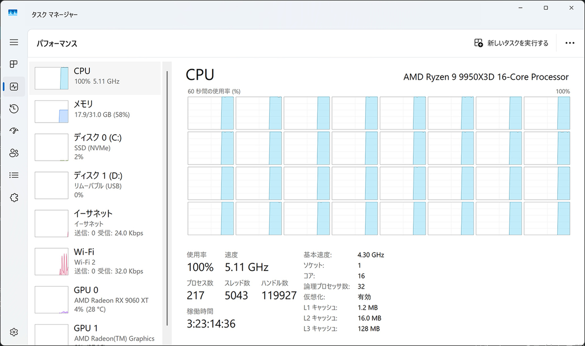 | CPU | AMD「Ryzen 9 9950X3D」 (16コア/32スレッド、最大5.7GHz、TDP170W) |