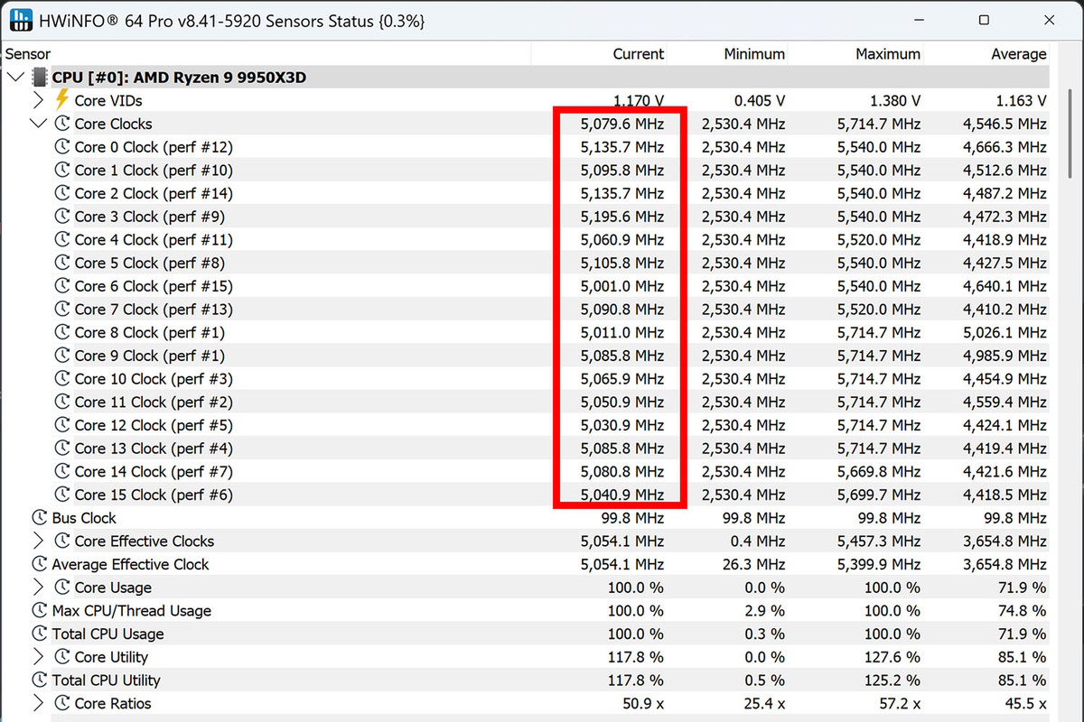 室温18度という季節の影響もあるが、「Cinebench 2026:30min」実行時のCPU温度は、最大でも67.9度で、30分間の平均も約65度に抑え込めていた。パフォーマンスもしっかりと引き出せており、動作クロックは安定して5GHz台で推移している。
