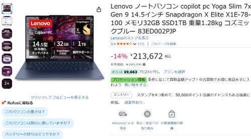 Lenovoの14.5型ノートPC「Yoga Slim 7x Gen 9(83ED002PJP)」が、Amazonで割引対象。参考価格249,700円のところ、14%オフの213,672円で販売中。