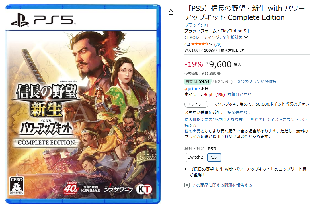 私が今回オススメしたいゲームタイトルは、「信長の野望・新生 with パワーアップキット Complete Edition」です。パッケージ版の参考価格は11,880円ですが、今なら19%オフの9,600円でAmazonから購入できます。