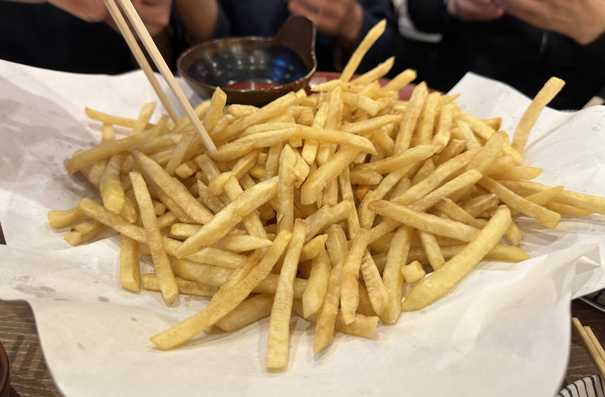 こちらはポテトフライの「バカ盛り」だ。スーパーマーケットなどで売っている冷凍のポテトフライで例えるなら、大袋1袋分をすべて揚げて、お皿にそのまま全部入れた、みたいな量である。いや、それよりも多分多い。この写真のときなど、「大バカ盛りの方がよさそうですかね?」とスタッフさんに尋ねたら、「いや〜、おそらくバカ盛りで十分に多いかと思いますが……」と言われたのを覚えている。
