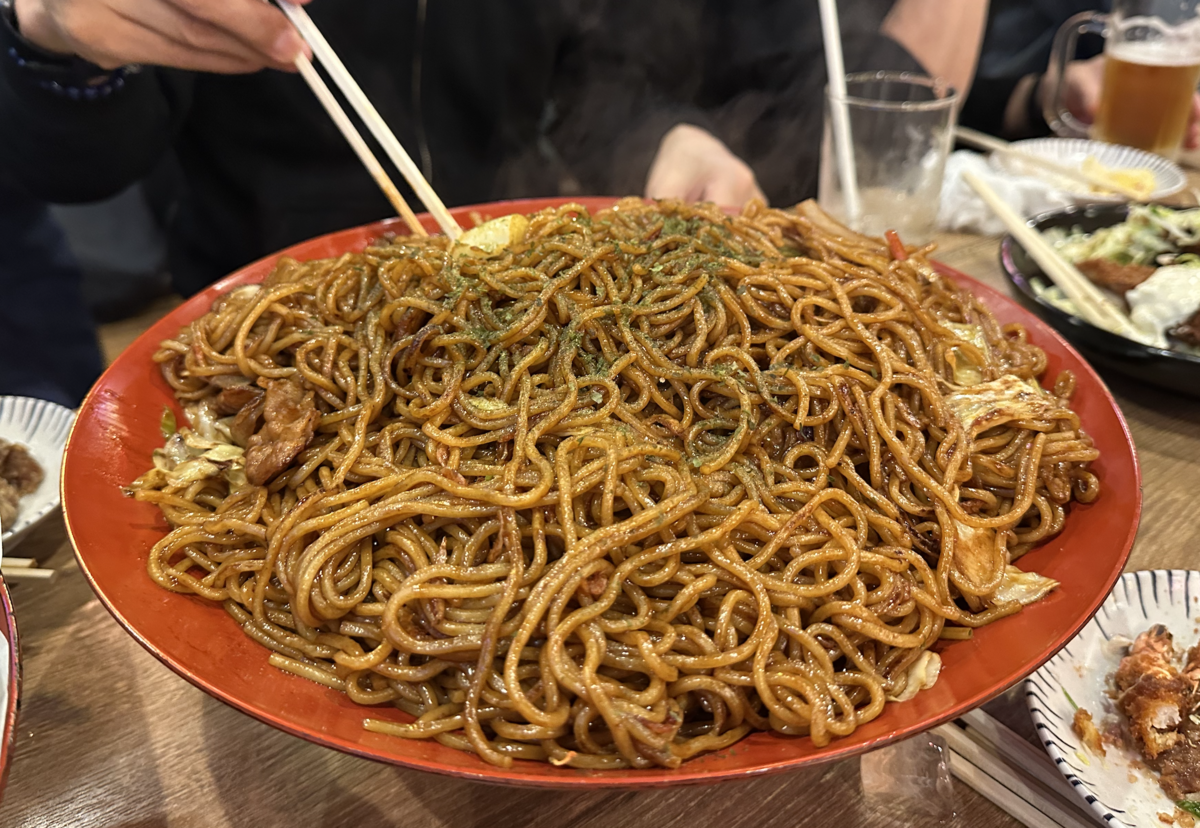 ここで冒頭の写真を見てほしい。写真で見るとスケール感が伝わりにくいのだが、この器は直径30cm、40cmにも及ぼうかという「大盃」である。その大盃にドカーン!と大量の焼きそばが盛られているのである。実際に目の前にすると、その量には圧倒される。