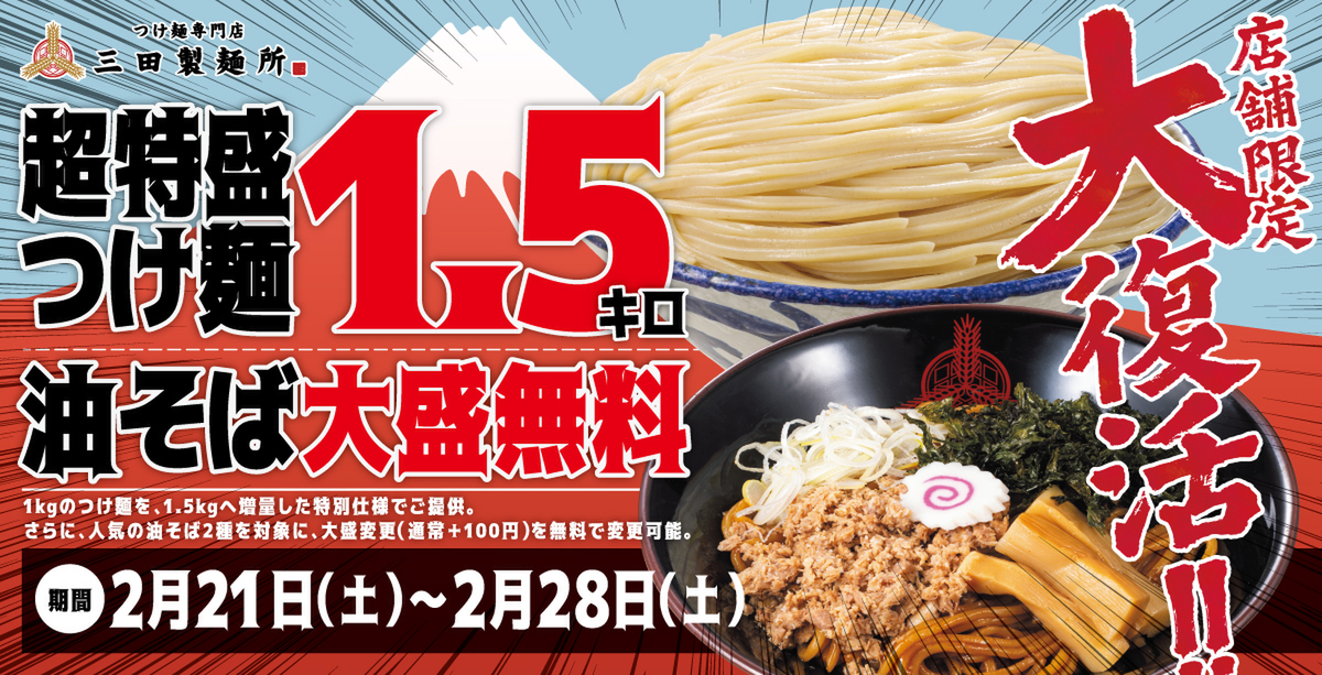 三田製麺所は2月21日~28日の期間限定で、「超特盛り1.5kgつけ麺&油そば大盛無料キャンペーン」を実施します。