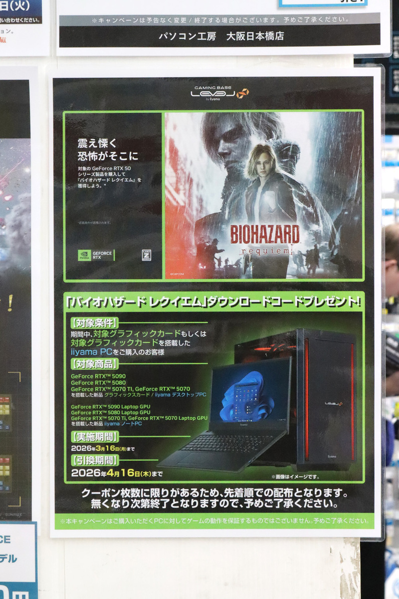 そのほか、パソコン工房 大阪日本橋店ではお得なキャンペーンも実施中。「GeForce RTX 5070/5070 Ti/5080/5090」を搭載した単品ビデオカード、または同GPU搭載のiiyama製デスクトップPC・ノートPCの購入者を対象に、カプコンの人気シリーズ最新作「バイオハザード レクイエム」のダウンロードコードをプレゼントしています。