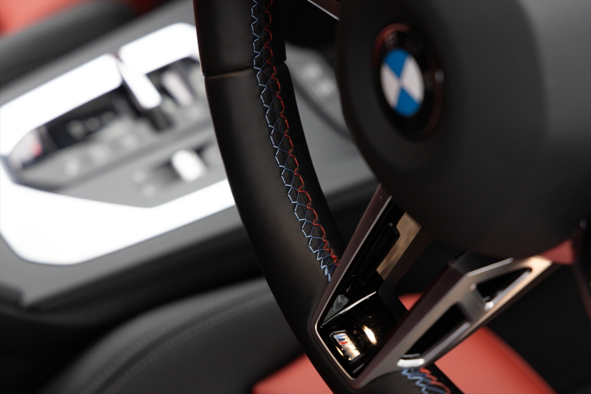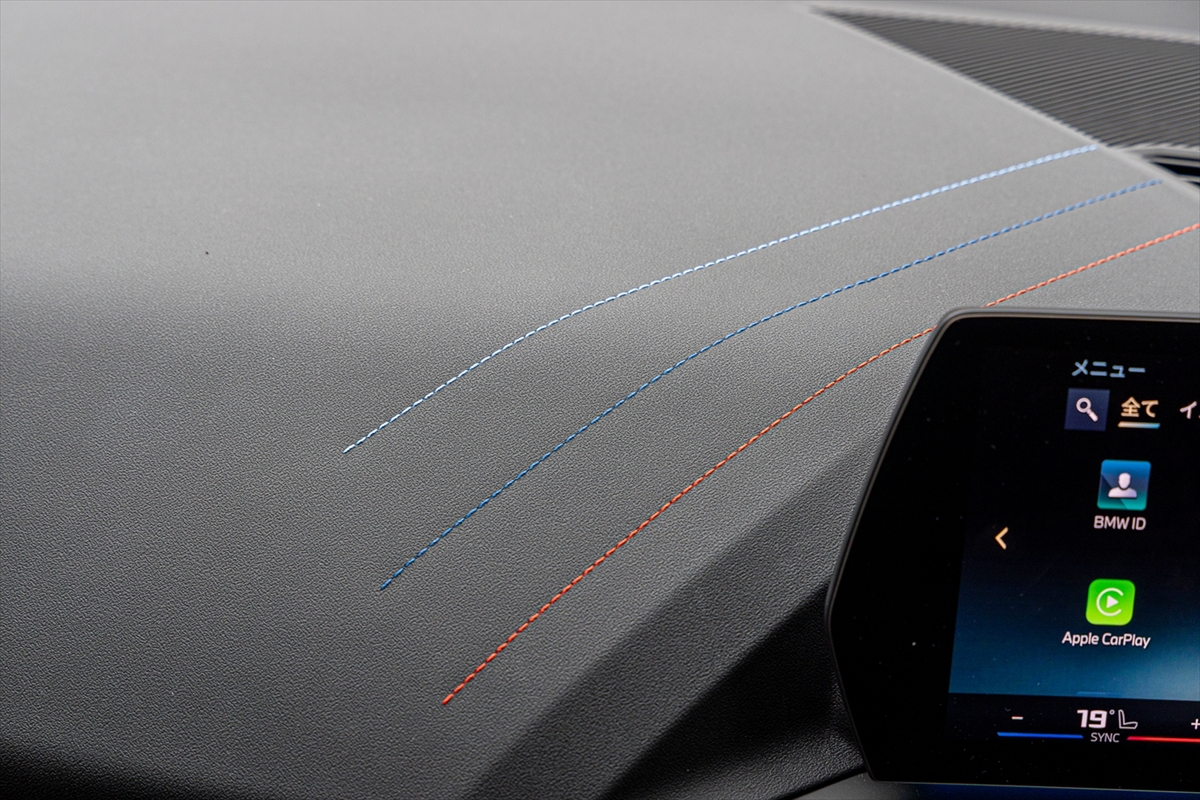 車内はカジュアルな雰囲気でありながら、イイモノ感を漂わせています。そして、ところどころにBMWのMらしいステッチが奢られています。特に助手席のステッチは、今までありそうでなかったもの。