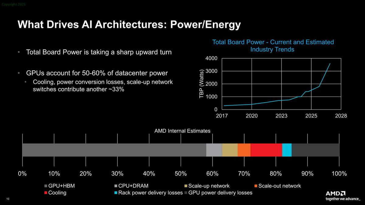 ちなみにプロセッサーの消費電力の内訳が下の画像である。AMDなので当然モデルはInstinct MIシリーズのものと思うが、全体の半分強がGPU+HBMで、残りはその他ということになる。