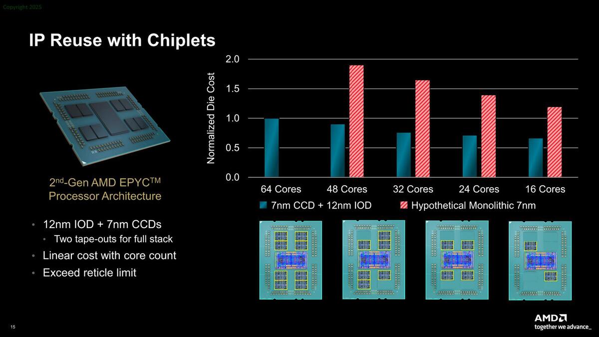 ダイ1個当たりの原価は274ドルほど。4つで1096ドル。実際にはインターポーザーなどの分が加味されるが、それでも1200ドル程度であって、大きなダイの場合の半額未満で構成できることになる。