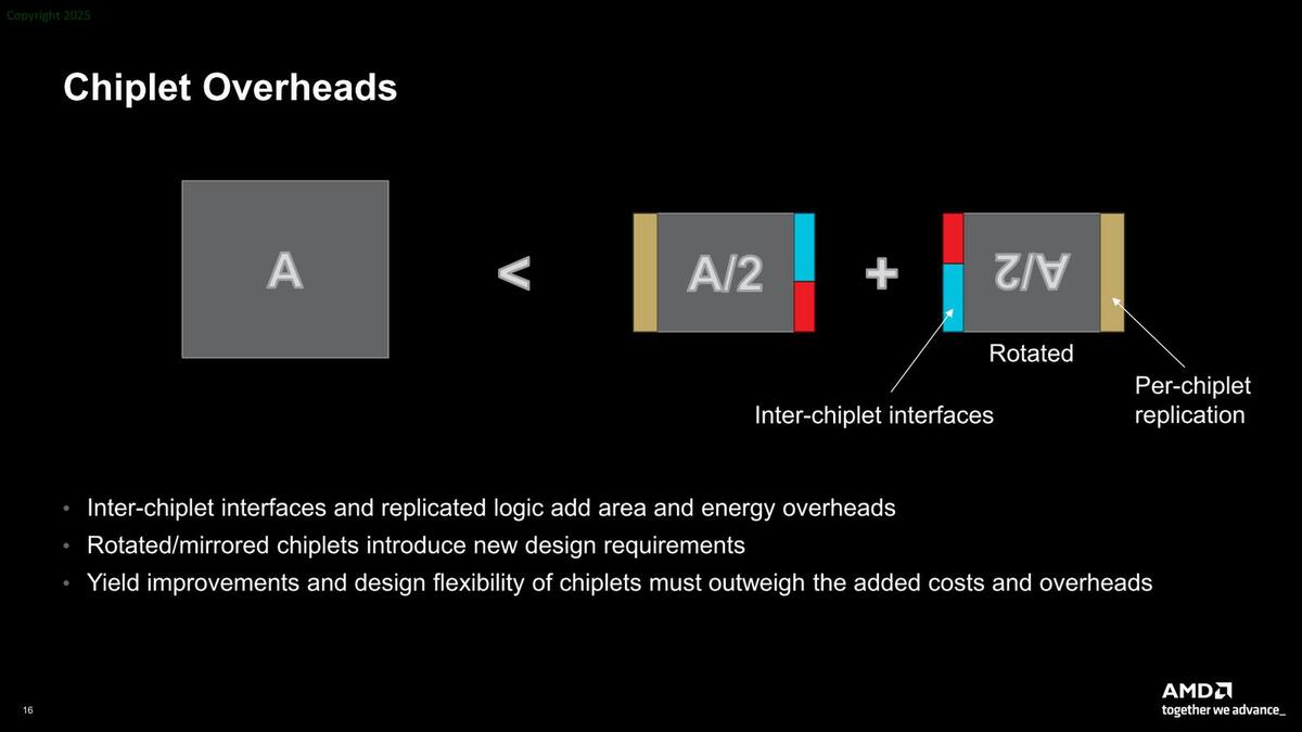 もちろんメリットだけではなくデメリットもある。まずは物理的に、チップレット構成にすることでダイが大型化する。要するに2つのチップレットを接続するためのPHYや、場合によってはコントローラーも追加する必要がある。またチップレット同士をどう接続するかも問題である。