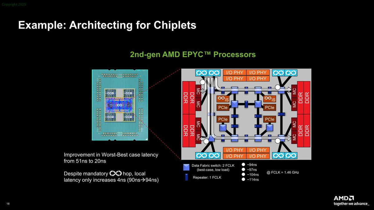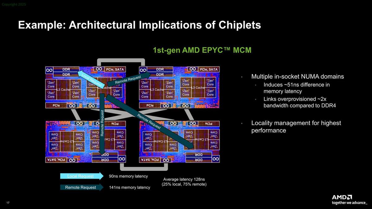 また性能面でのオーバーヘッドも存在する。下の画像はIoDを使わない、初代EPYCのケースであるが、ここではインフィニティ・ファブリックで4つのダイを相互接続する(この通信が51ナノ秒ほど発生する)関係で、ローカルのメモリーコントローラーのレイテンシーが90ナノ秒なのに対し、リモートでは141ナノ秒ほどになる。