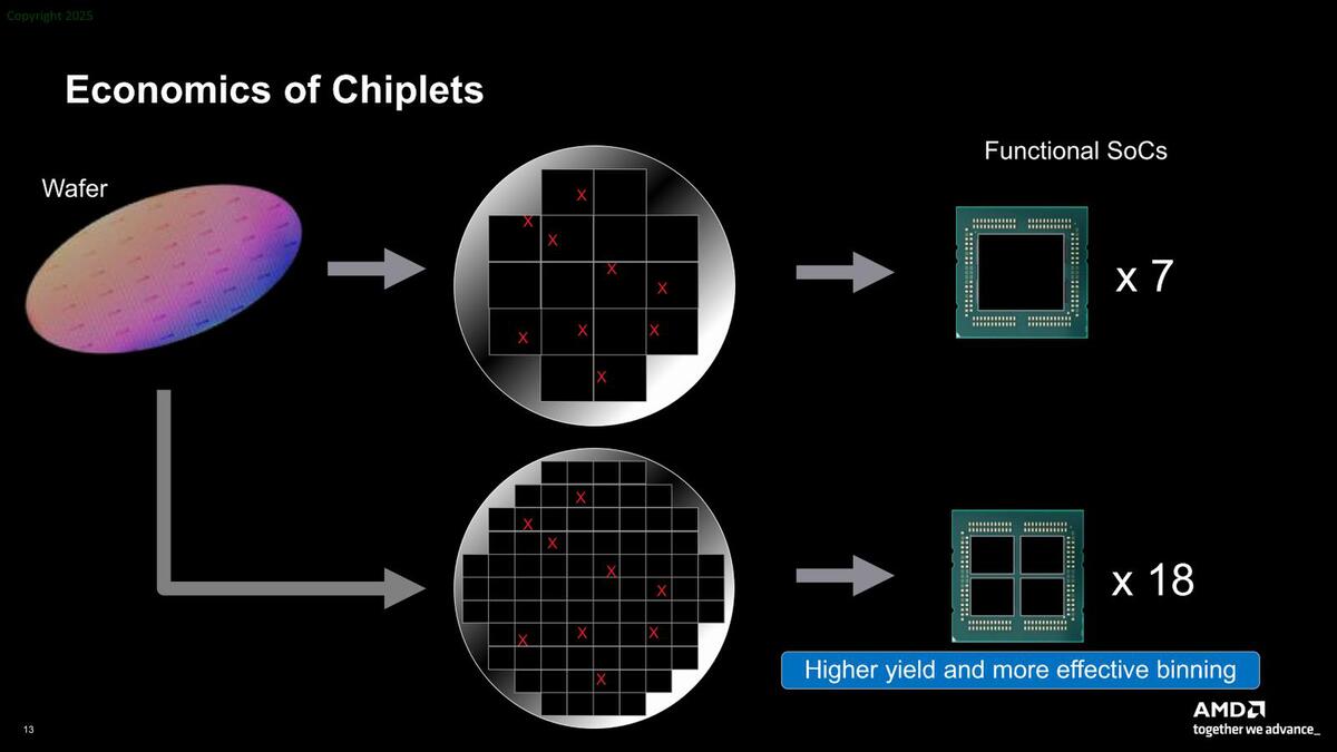 さて話はチップレットに移る。チップレットのメリットとして一番大きいのが経済性である。同じウェハーからとれるダイサイズを小さくすると、それだけ歩留まりが改善する。これはそのままコスト削減につながる。