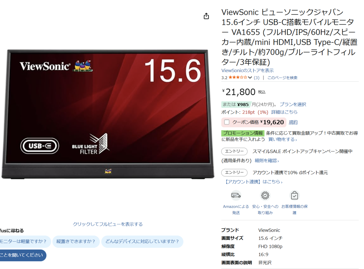 Amazon.co.jpの販売価格は21,800円だが、現在は2,180円引きのクーポンが用意されており、適用すればVA1655を19,620円で購入可能!クーポンの利用期限は、2月23日(月)までとのこと。