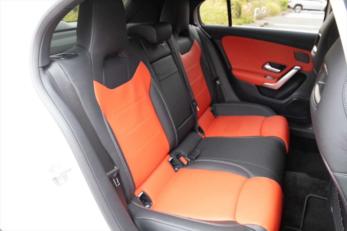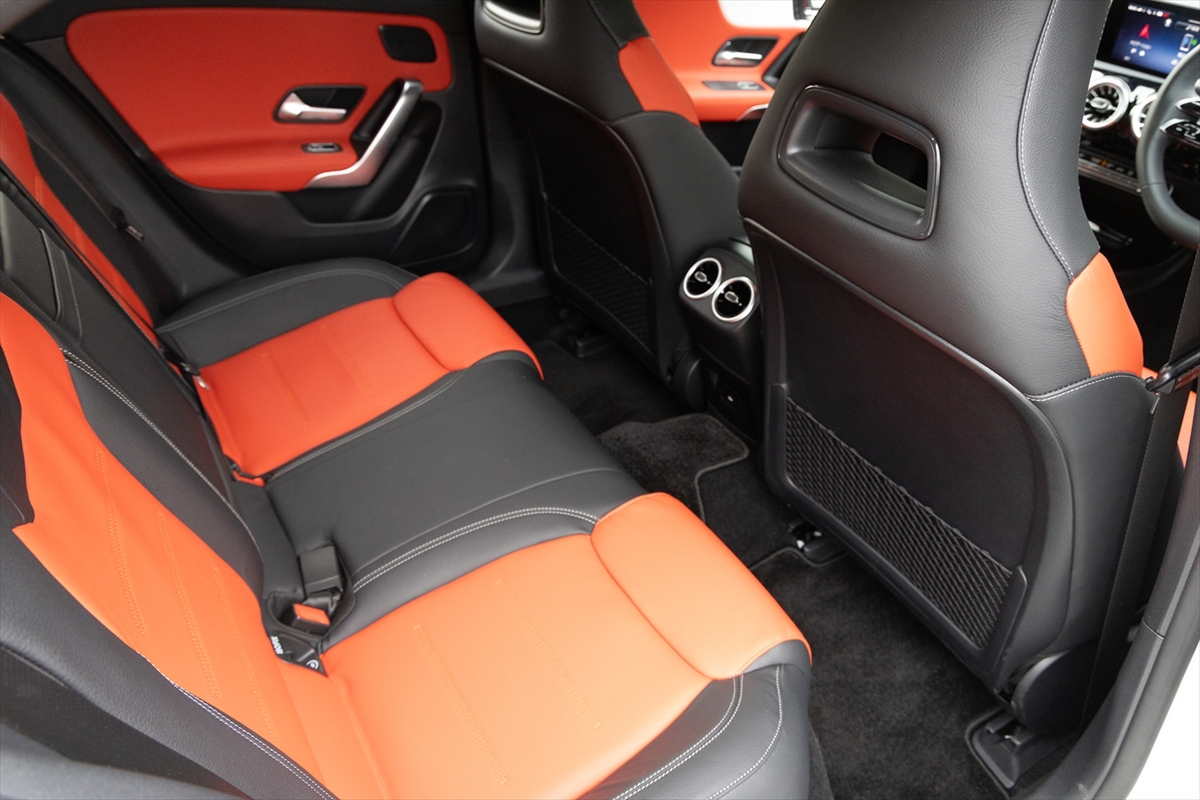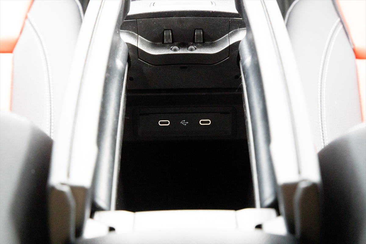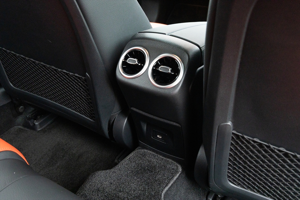 「AMGレザーエクスクルーシブパッケージ」というだけあって、かなりスポーティーな後席。ヘッドルームは高く、また見た目に比べて足元は広くなっています。センタートンネルは大きめなので、中央に座るのは子ども限定といったところ。ドアはかなり広い角度まで開閉するのですが、サイドシルが立っているのでお年寄りが乗るには少し苦労するかもしれません。USBはType-Cが1ポートのみ。