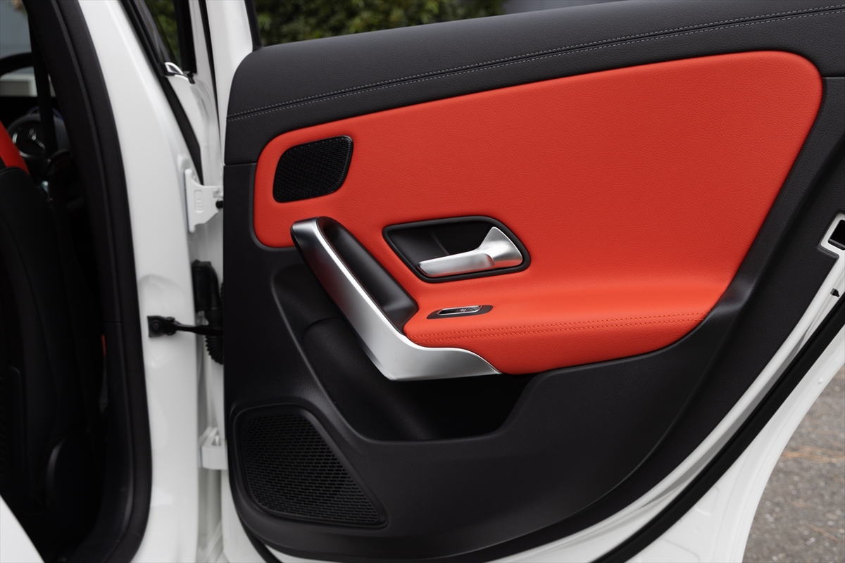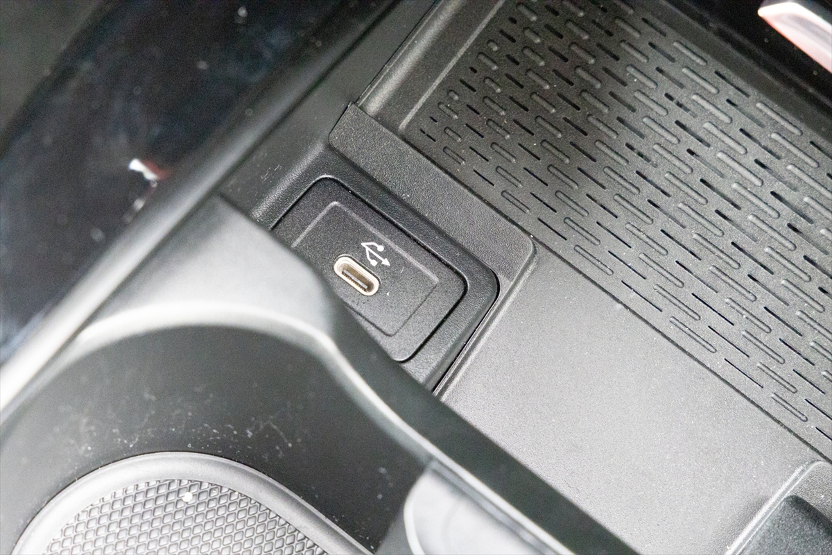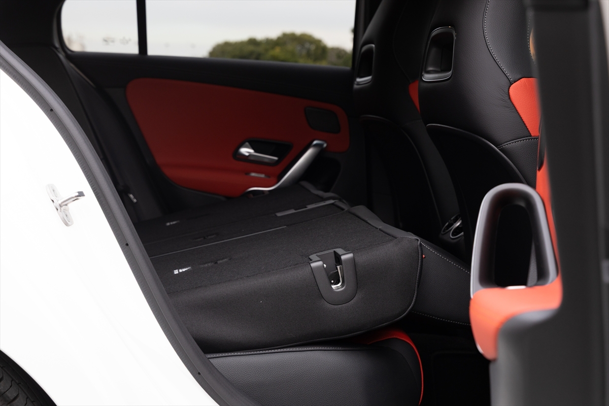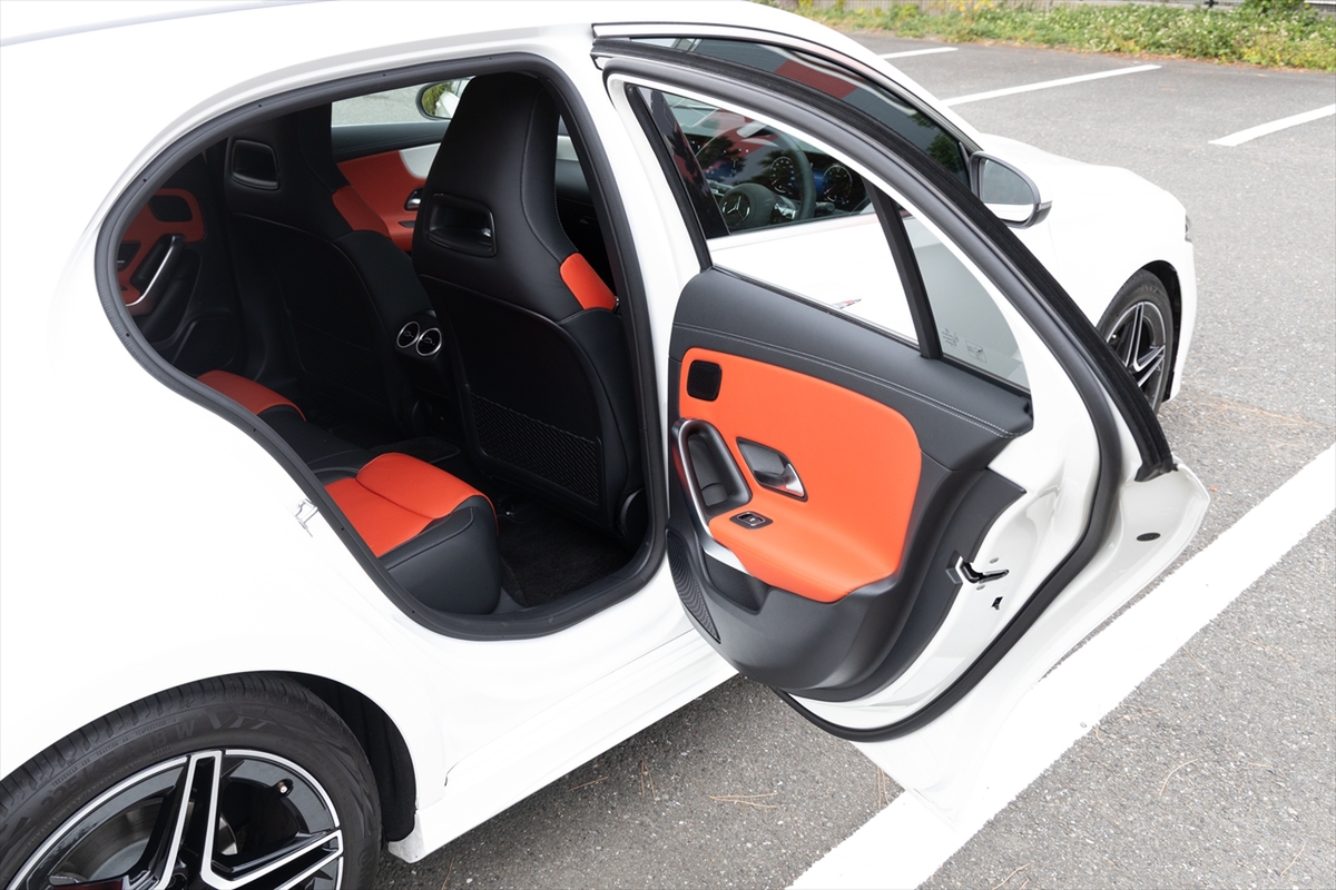 「AMGレザーエクスクルーシブパッケージ」というだけあって、かなりスポーティーな後席。ヘッドルームは高く、また見た目に比べて足元は広くなっています。センタートンネルは大きめなので、中央に座るのは子ども限定といったところ。ドアはかなり広い角度まで開閉するのですが、サイドシルが立っているのでお年寄りが乗るには少し苦労するかもしれません。USBはType-Cが1ポートのみ。