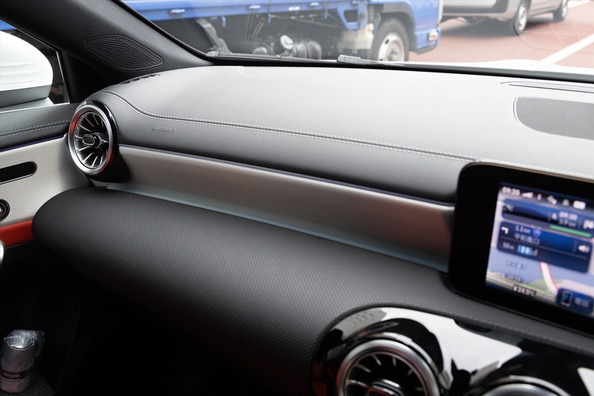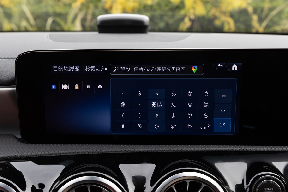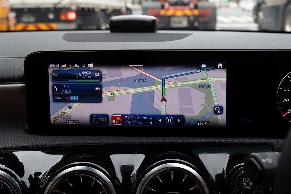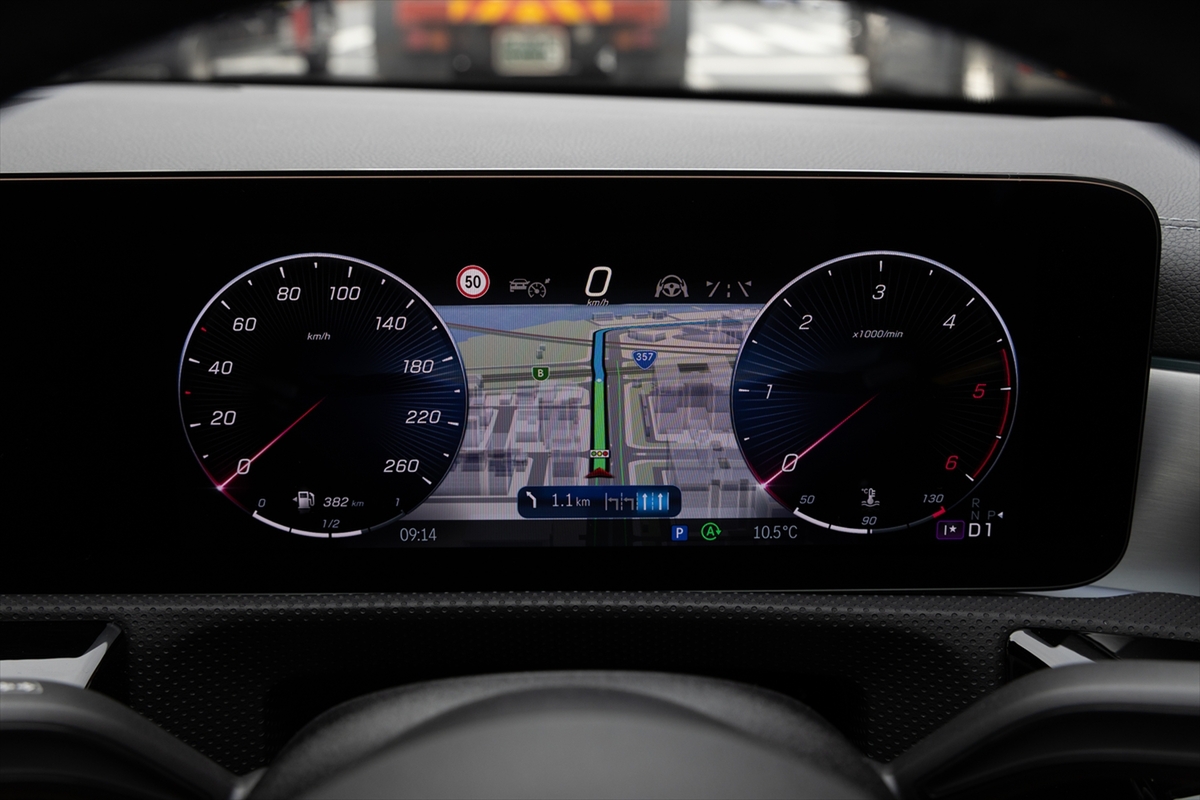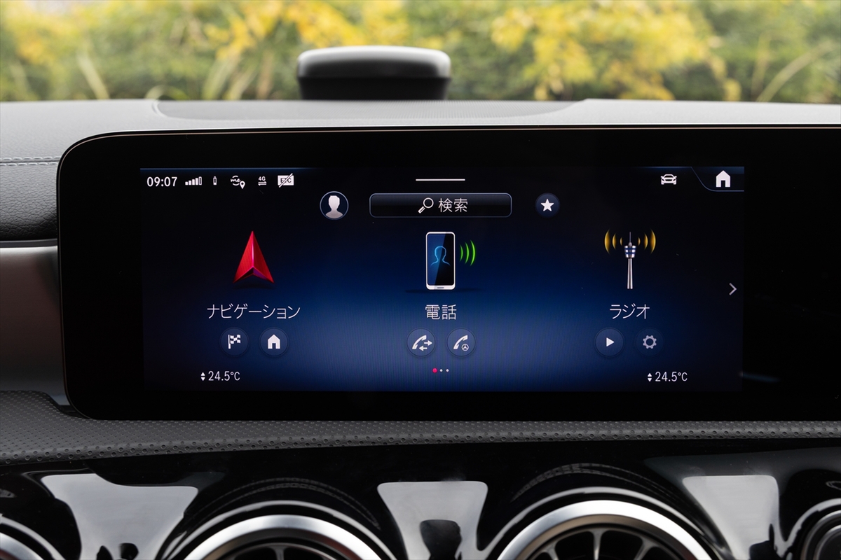 メーターパネルとインフォテインメントをつなげたワイドディスプレイはイマドキ。サイズは10.25インチとちょっと小さいですが、表示内容は上位モデルと同等です。というのも、メルセデス独自のインフォテインメントシステム「MBUX」の最新世代を搭載しているから。「ヘイ! メルセデス!」というと音声で目的地入力できます。