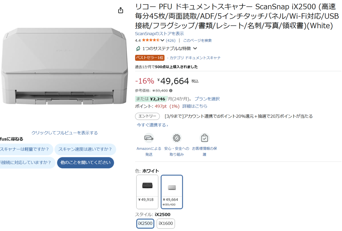 データ化を習慣にするなら、“早く終わる”道具が一番続きます。iX2500は両面読み取りに対応し、毎分45枚でスピーディーに取り込めるため、まとめてスキャンする運用にも向きます。Wi-Fi/USBの両対応で設置環境に合わせやすいのもポイントです。価格は変動しますが、現在のAmazonでは49,664円と5万円未満で購入可能です。