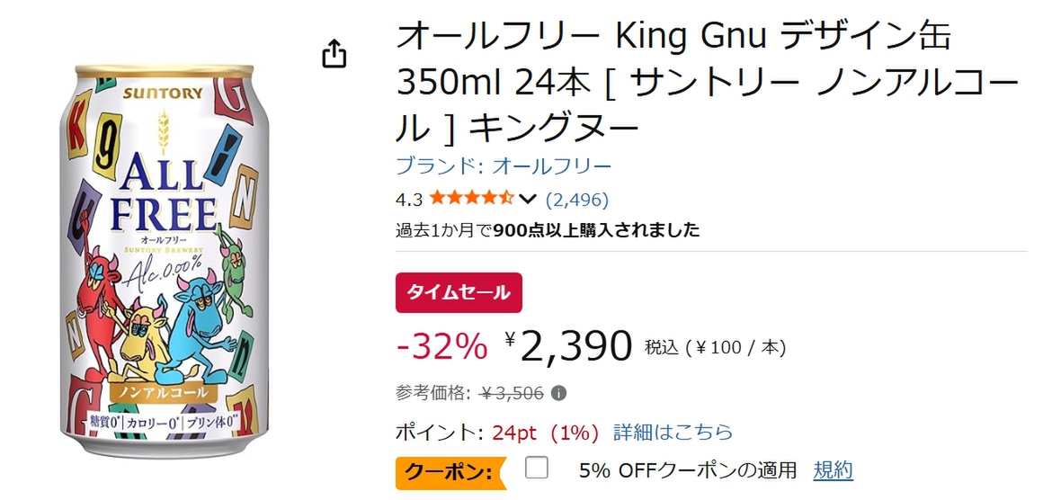 サントリーのノンアルコール飲料「オールフリー King Gnu デザイン缶 350ml 24本」が、現在開催中のAmazonタイムセールの対象商品となっています。