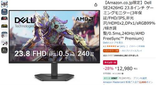 Dellの23.8型ゲーミングモニター「SE2426HG」が、Amazonでタイムセール対象。参考価格17,980円のところ、28%オフの12,980円で販売中。