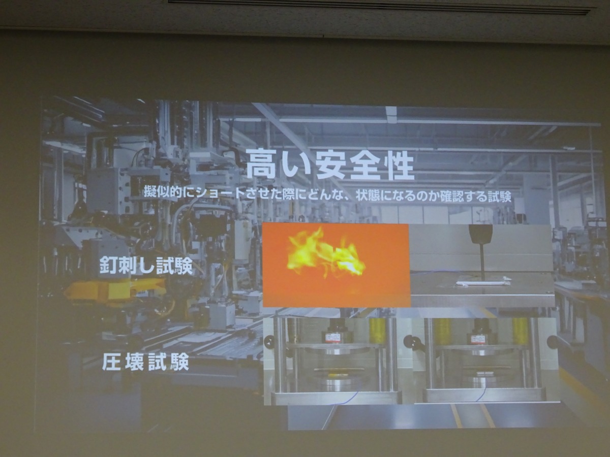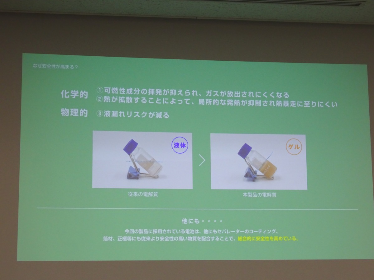半固体電池は、内部の電解液をゲル状にしているのが最大の特徴。これにより液漏れのリスクが低減されるほか、従来の発火事故の一因ともされる可燃性有機電解液の使用量を削減。内部短絡(ショート)時の可燃性ガスの発生や放出を抑制し、安全性を大きく高めている。