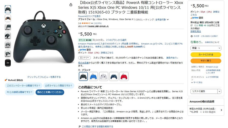 Amazon.co.jpにて、PowerAのXbox・PC用有線コントローラーが販売中だ。価格は5500円。