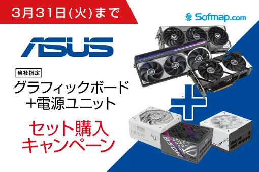 ソフマップは3月31日までの限定期間中、ASUS製の最新グラフィックボードと電源をセットで購入することで、最大10,000円の値引きが適用されるキャンペーンを開催中だ。