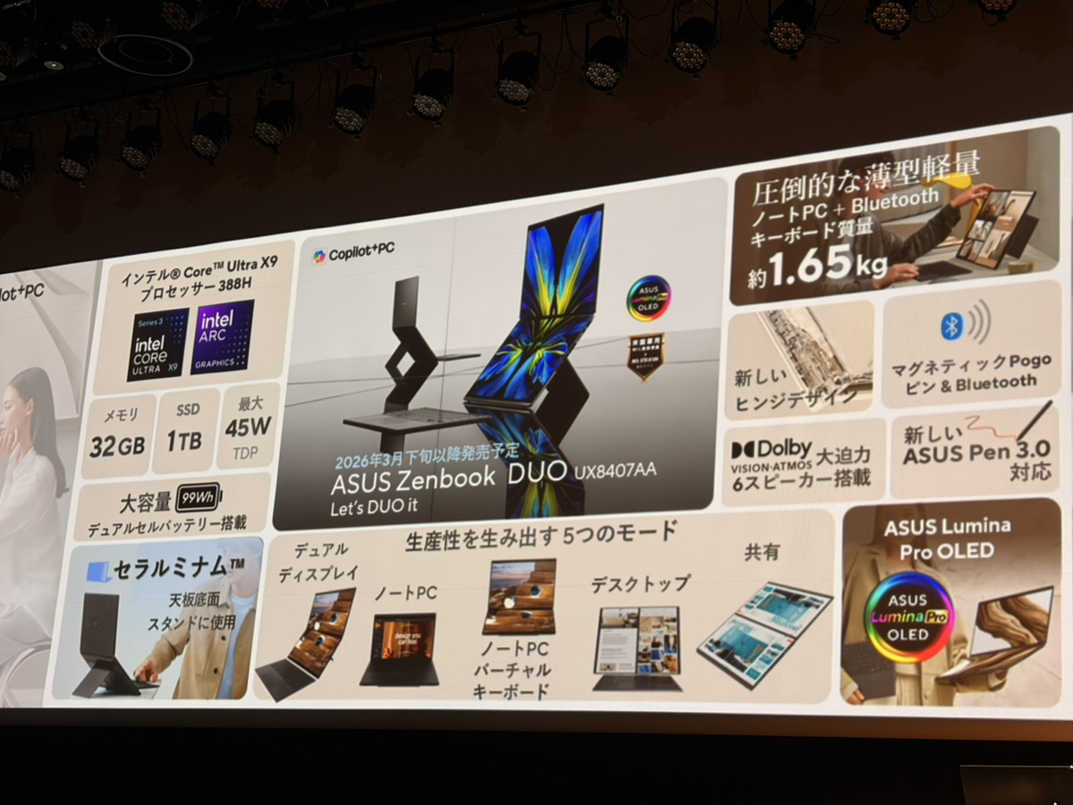 発表されたのは、2つの14型有機ELディスプレーを備えた「ASUS Zenbook DUO UX8407AA」、洗練されたデザインと驚異的な薄さを両立した「ASUS Zenbook S14 UX5406AA」、アクションカメラブランド「GoPro」とのコラボによる「ProArt GoPro Edition (PX13 | HN7306EAC)」の計3モデルとなる。