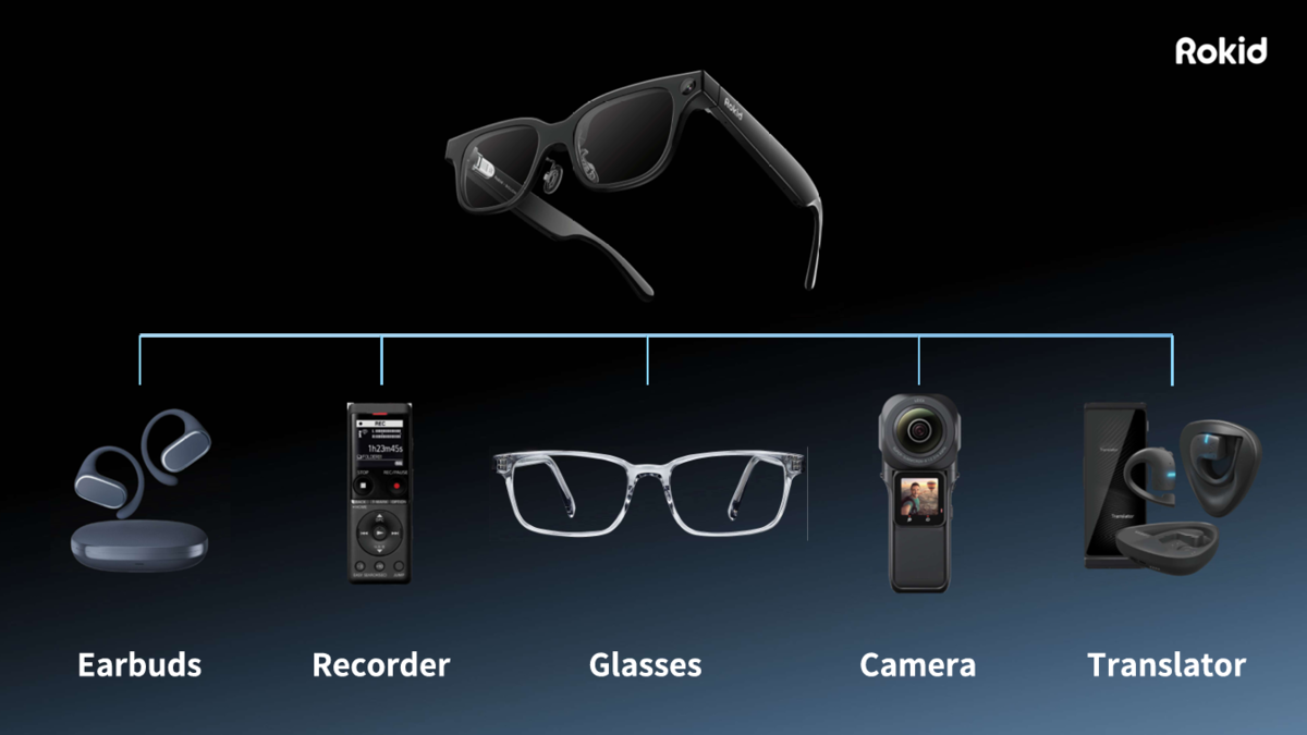 Rokid スマート AI グラスは、重さ約49gと軽量ながら、イヤフォン、レコーダー、カメラ、翻訳機といった複数の機能を備えたスマートグラスだ。これらの機能にAIとARを加えることで、利便性をかなりアップさせているのも特徴となっている。