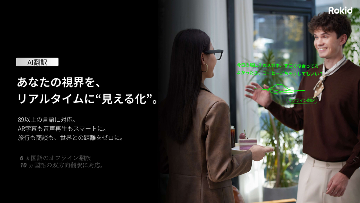 リアルタイム翻訳に対応しているのも、本製品の魅力の1つ。相手の言葉を聞くと、視界に日本語字幕がリアルタイムで表示され、メニューや看板に視線を向けるだけで内容を読み解くことができる。89以上の言語に対応し、日本語、英語、中国語、ドイツ語、フランス語、スペイン語)はオフラインでも利用可能だ。