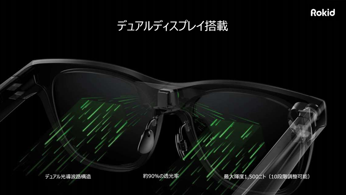 レンズはデュアルディスプレー構造になっており、透過率は約90%、最大輝度は1500ニト。輝度は10段階の調整が可能だ。