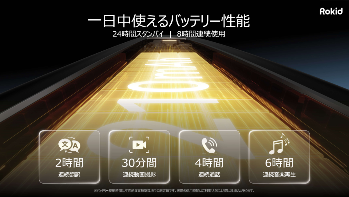 バッテリー性能としては、24時間スタンバイ可能なほか、8時間の連続使用が可能。翻訳であれば最大2時間、連続動画撮影であれば30分間、通話なら4時間、音楽再生なら6時間までできるとのことだ。