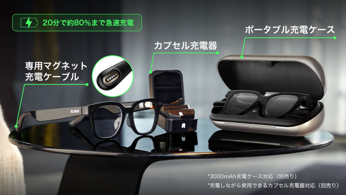 なお、オプションでポータブル充電ケースと、カプセル充電器も用意。カプセル充電器には、本体の充電専用マグネットに取り付けることで、かけたまま充電できる。急速充電にも対応しており、20分で約80%まで充電できる。