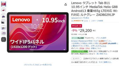 Lenovoの10.95型タブレット「Lenovo Tab B11(ZADB0291JP)」がAmazonでタイムセール対象。過去価格32,125円のところ、9%オフの29,200円で販売中。