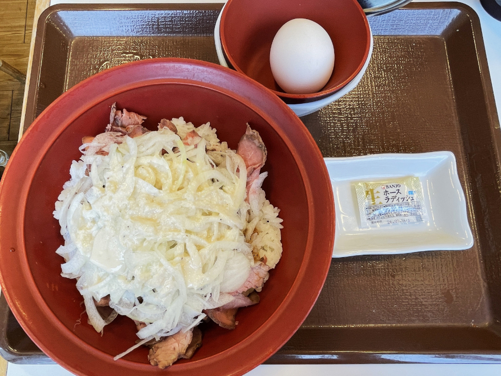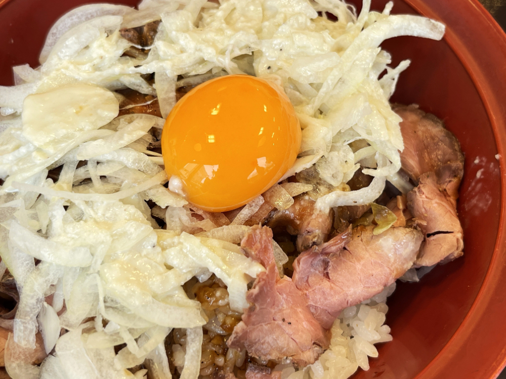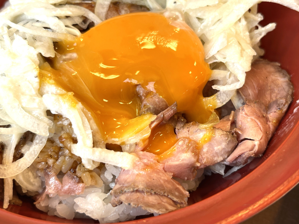 玉子は余計ではないかな?とも思ったのですが、そんなことはなく、玉子がのることでよりシャキシャキのオニオン、酸味のあるサワークリームソース、醤油だれがかかったローストビーフ丼が一体化してかっこみたくなるおいしさに。