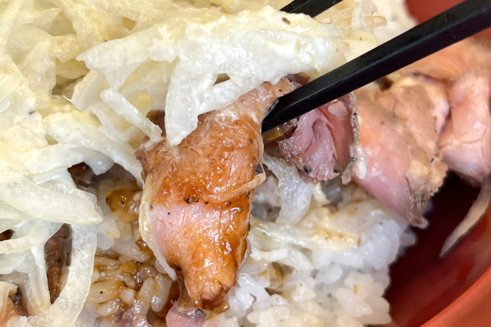 すき家のローストビーフは薄切りで、いわば「切り落とし」のようなカジュアルな感じ。それでも、しっとり柔らかく、さらに加熱しすぎたローストビーフにありがちな独特のにおいがないため、牛丼チェーンのローストビーフとしては少なくともガッカリしない質です。薄切りで小さいサイズなので、ご飯にもなじみやすいというのもポイントでしょう。