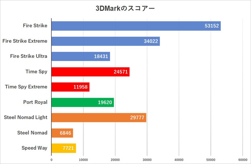 なお、Speed Way以外のテスト結果は以下にまとめておいたので、手持ちのPCなどとの性能比較に役立ててほしい。