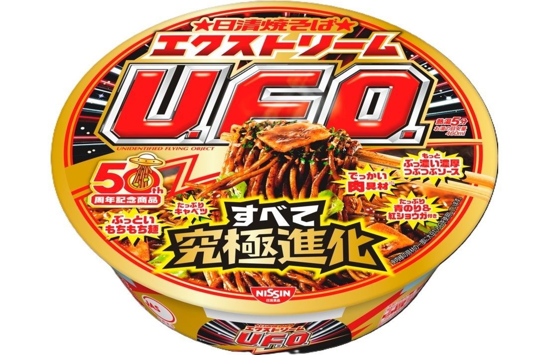 「日清焼そばU.F.O.」は1976年に発売されたロングセラーカップ麺ブランド。今回、50周年を記念した商品として、ソース、麺、具材、ふりかけのすべてを "究極進化" させた限定商品を展開する。