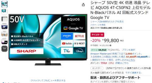 シャープの50V型4K液晶テレビ「AQUOS 4T-C50FN2」がAmazonでタイムセール対象。参考価格125,455円のところ、20%オフの99,799円で販売中。