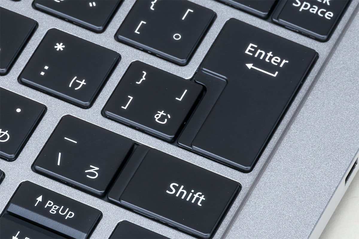 キーボードは全体的に標準的ですが、細かい部分でややクセを感じる配列です。特にEnterキーと「]」キーの間にスペースがないため、慣れるまでは誤入力が起きる可能性があります。