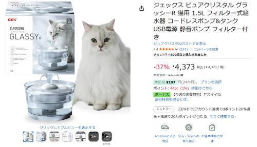 ジェックスの猫用給水器「ピュアクリスタル グラッシーR(1.5L)」がAmazonで割引対象。参考価格6,980円のところ、37%オフの4,373円で販売中。