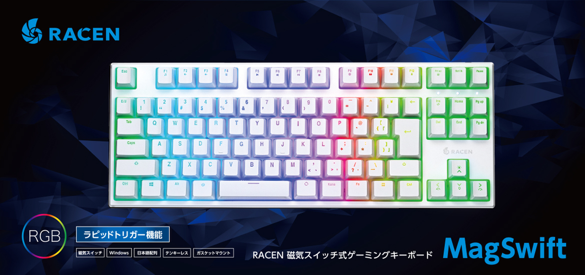 センチュリーは3月上旬より、「RACEN 磁気スイッチ式ゲーミングキーボード MagSwift」を発売する。価格は9,900円で、白モデル(型番:CRC-GKMGRT01WT)と黒モデル(型番:CRC-GKMGRT01BK)の2色展開となる。