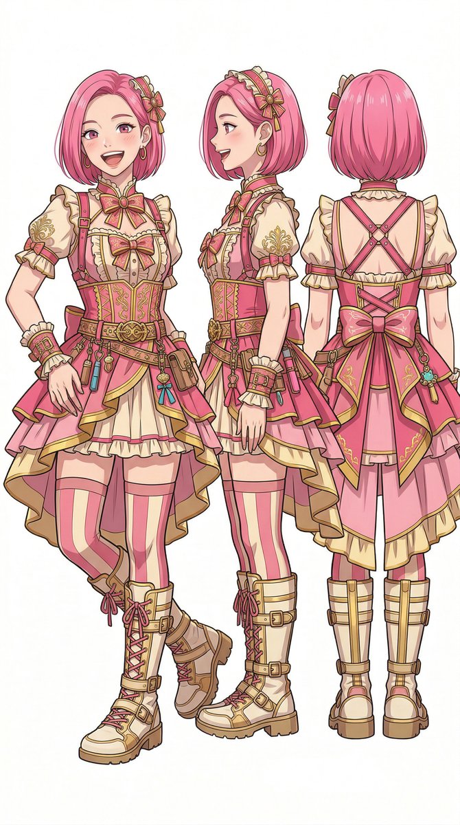 プロンプト(3面図):架空のアニメ風キャラクター。元気いっぱいハイティーン日本人女性、ショートボブのピンク髪、ゴテゴテしたデザインのコスプレ風衣装。明るい表情。白背景。正面・横・後ろの3面図。