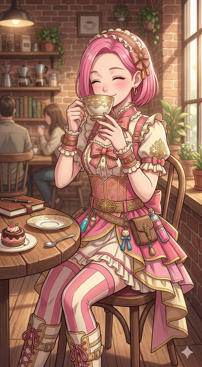 プロンプト(カフェ):この画像のキャラクターを使って、カフェでコーヒーを飲んでいるシーンを描いてください。キャラクターの髪色・衣装・顔立ちを維持してください。アニメ風イラスト。