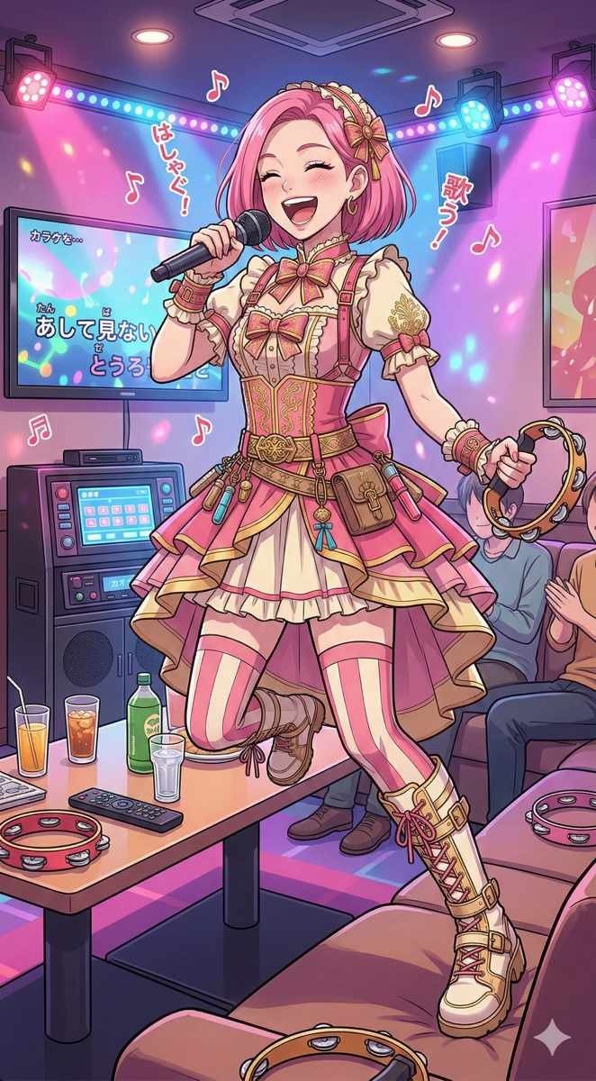 プロンプト(カラオケ):この画像のキャラクターを使って、カラオケルームではしゃいでマイクを持って歌っているシーンを描いてください。キャラクターの髪色・衣装・顔立ちを維持してください。アニメ風イラスト。