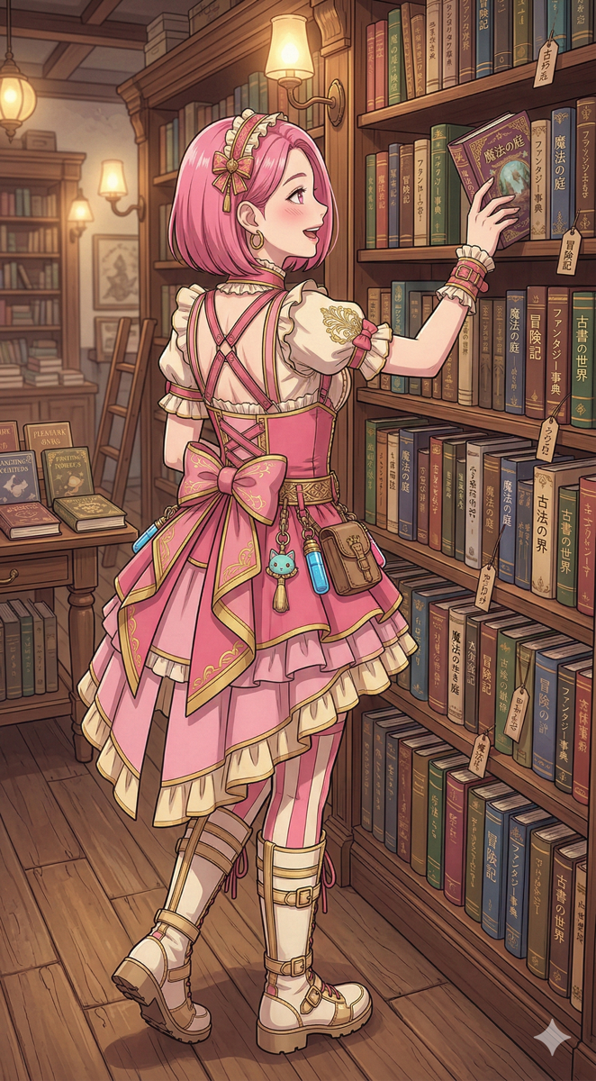 プロンプト(本屋):この画像のキャラクターを使って、本屋で棚から本を選んでいるシーンを描いてください。キャラクターの髪色・衣装・顔立ちを維持してください。アニメ風イラスト。