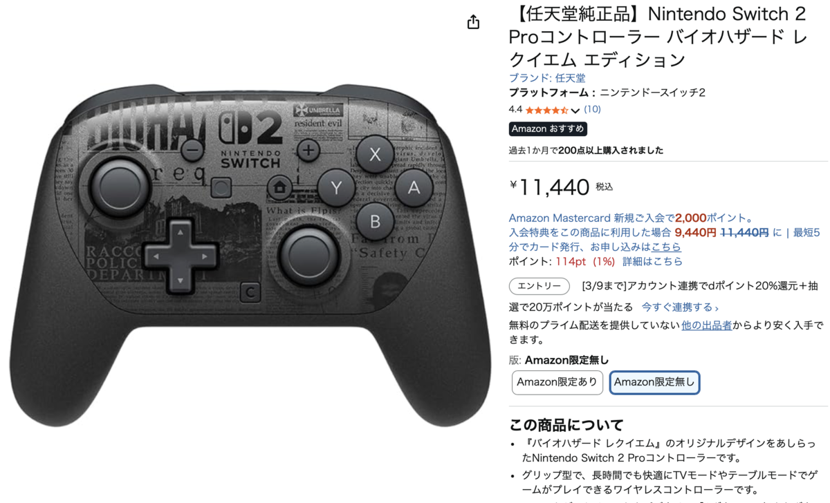 Amazon.co.jpにて、「【任天堂純正品】Nintendo Switch 2 Proコントローラー バイオハザード レクイエム エディション」が販売中だ。価格は1万1440円。