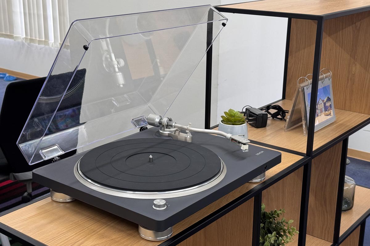 ターンテーブルはベルトドライブ方式で、Bluetooth接続機能も搭載。シンプルで質感の高いデザインを採用したデノンの中堅機種だ。2023年登場のフラッグシップ機「DP-3000NE」(38万5000円)に迫る体験を、オーディオ機器としては比較的リーズナブルな価格帯で提供するのがポイントだ。