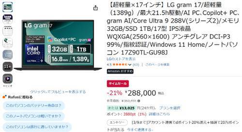 LGの17型ノートPC「LG gram 17(17Z90TL-GU98J)」がAmazonでタイムセール対象。参考価格363,455円のところ、21%オフの288,000円で販売中。