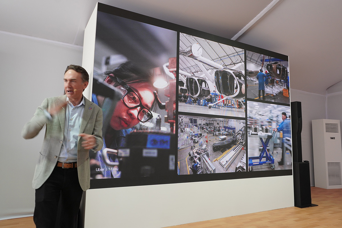 以前はUberのメンバーとしてUber Elevateのプロジェクトを率い、現在はJoby Aviationの最高製品責任者を務めるエリック・アリソン氏がデモンストレーション飛行をするJoby S1の機体について解説しました。