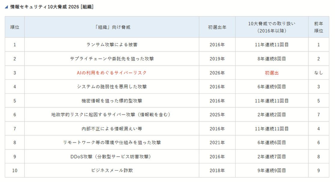 | 情報セキュリティ10大脅威 2026 [組織] | ||