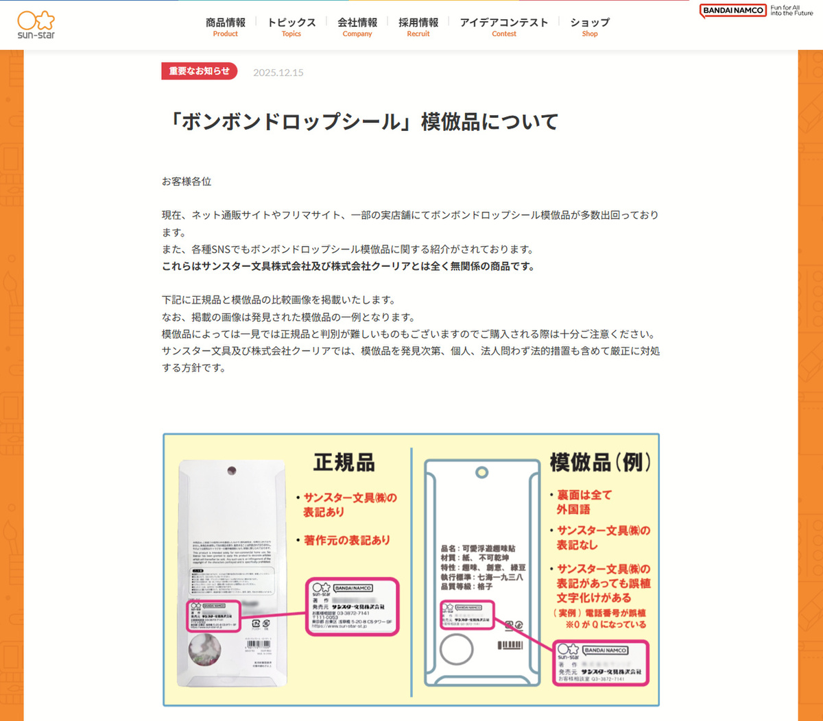 同様の告知は販売元のサンスター文具株式会社からも発表されており、「模倣品を発見次第、個人、法人問わず法的措置も含めて厳正に対処する方針」だとしています。