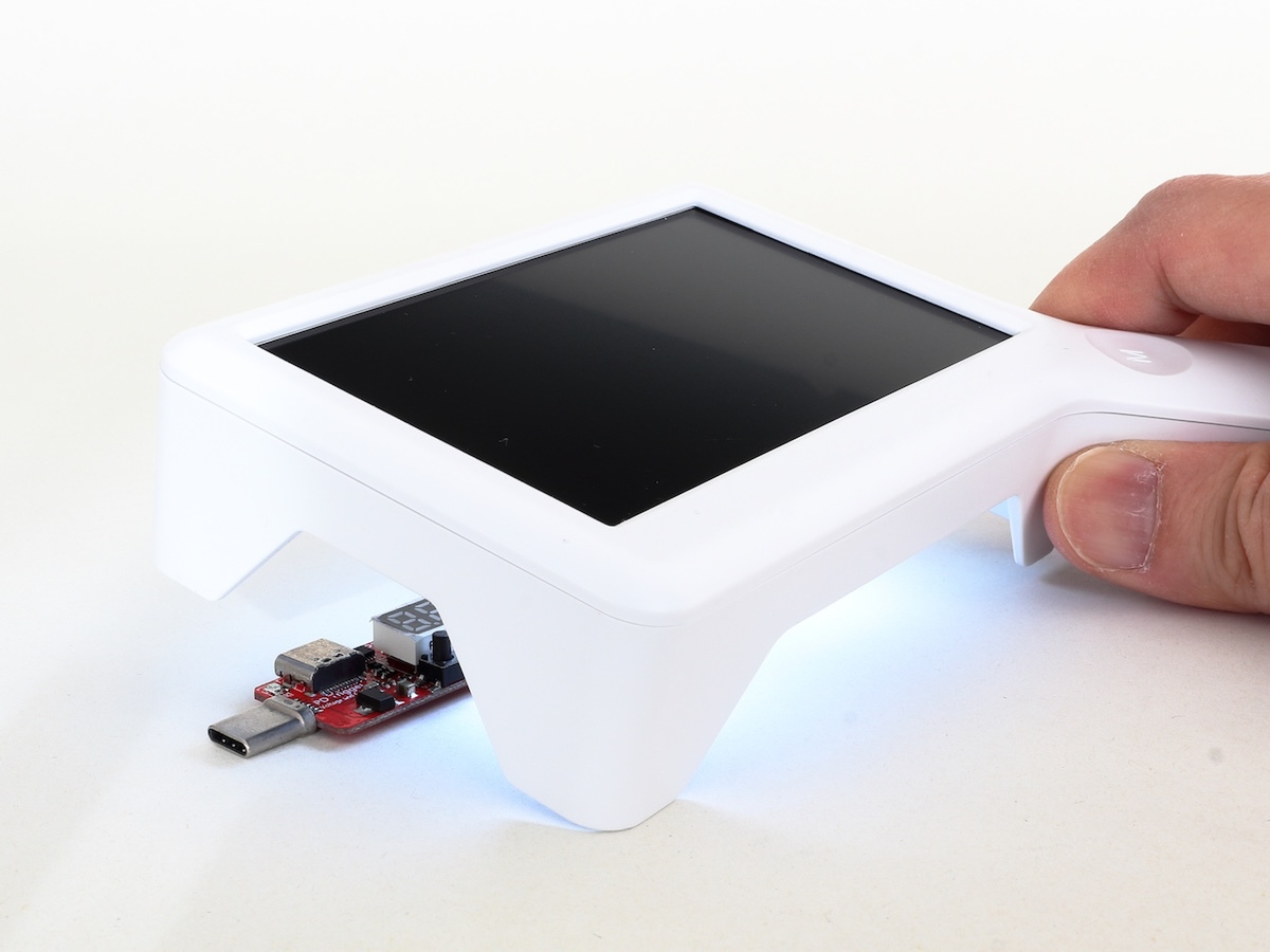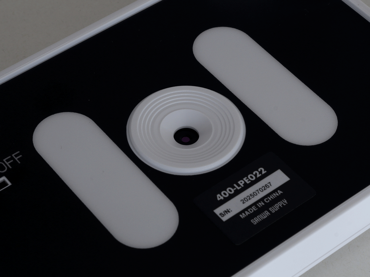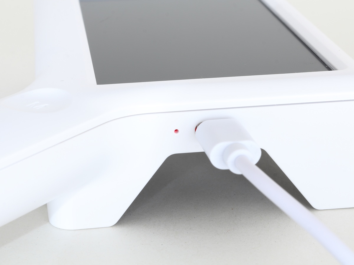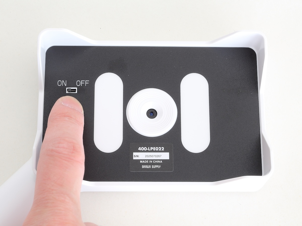 本体をひっくり返すと、CMOSセンサーとライトの横に電源スイッチがあります。これをONにすれば準備完了。あとは表のMボタンをタッチするとLEDが点き、起動画面が表示されて使えるようになります。